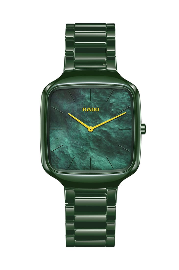 ▲True Square真我方形系列超薄高科技陶瓷錶「深邃綠」款式以綠色珍珠母貝面盤搭配黃色漆面指針,對比強烈、視讀效果也很清楚。