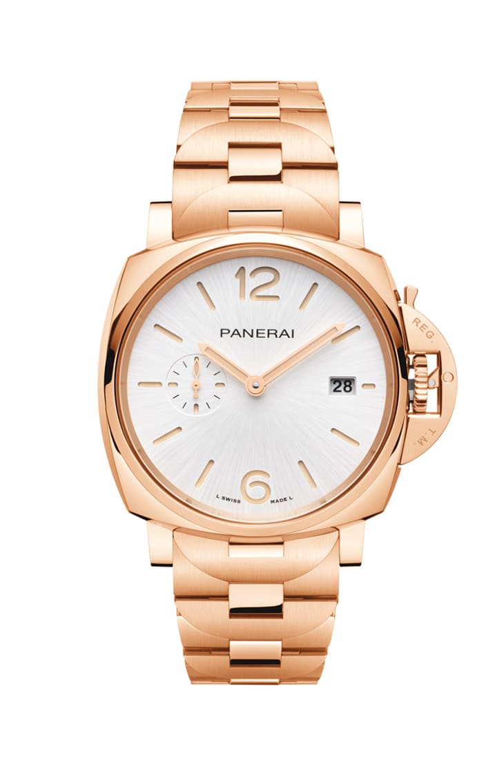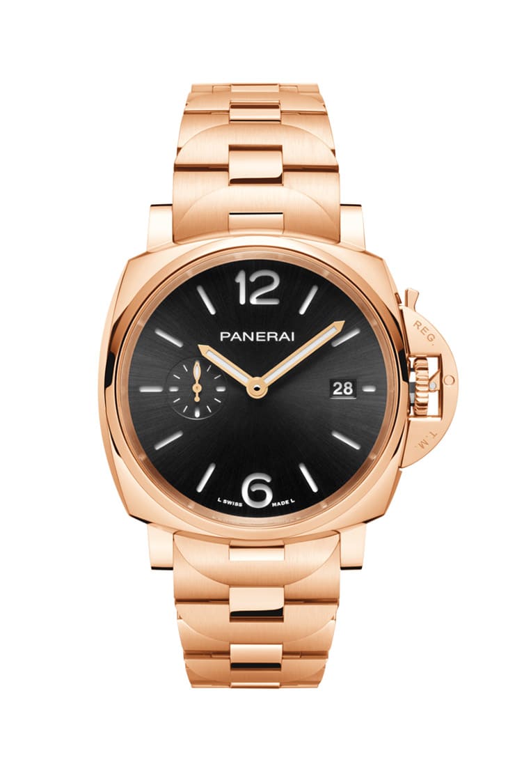 Luminor Due系列另有兩款Goldtech™紅金款式,分別是Luminor Due TuttoOro PAM01494與PAM01442,它們的錶徑都是42mm,從錶殼、錶圈到鍊帶全以Goldtech™紅金製成。PAM01494的面盤是白色太陽放射紋配米白色夜光塗料,PAM01442又換成黑色太陽放射紋配白色夜光塗料,有別於前面提到的三只不鏽鋼Luminor Due一律採用實底蓋,貴金屬款式的Luminor Due鍊帶錶則擁有透明底蓋設計,讓人可以好好欣賞手錶內部的P.900自動機芯。