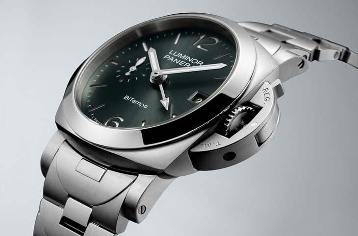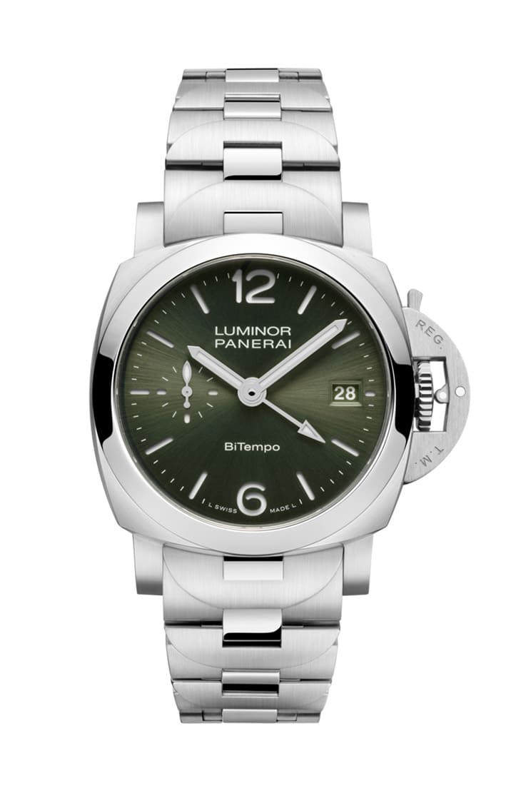 最後看到的是Luminor Quaranta BiTempo PAM01640,這款錶也是不鏽鋼材質,當然錶殼、錶圈和鍊帶都是用這種金屬製作,至於手錶面盤則是綠色太陽放射紋,搭配白色的夜光塗料,至於面盤的時、分、小秒和兩地時間指針都是銀色,顯得一副清爽俐落的風格。而這款錶面盤6點方向印有"BiTempo"字樣,這點相較於前面幾款稍微特別,這是義大利文的「雙時區」意思,直接突顯出手錶在功能性上的特點,也是現在被公認最實用的手錶功能之一。