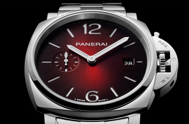 這次換上新鍊帶的按照系列和材質可以概要分為三種。其中Luminor Due系列有不鏽鋼款式3只,分別是Luminor Due Metal Bracelet PAM01508、PAM01539與PAM01387。PAM01508的錶殼為38mm,搭配白色太陽放射紋三明治面盤,上頭塗覆米白色的Superluminova®夜光塗料,而PAM01539與PAM01387都是42mm,前者的三明治面盤為酒紅色太陽放射紋,夜光塗料為白色,後者的三明治面盤則是碳灰色太陽放射紋,夜光塗料同樣也是白色的,由顏色的對比強化了清楚的視讀效果。