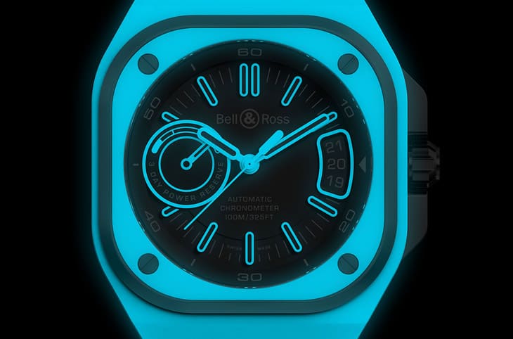 ▲BELL & ROSS推出新作BR-X5 Blue Lum延續品牌研發夜光技術的傳統,其在黑暗處錶殼會發出大範圍夜光。