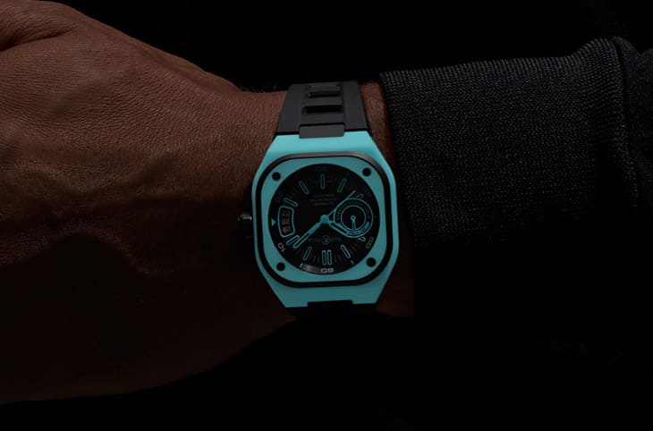 搶眼的外觀下,BR-X5 Blue Lum仍搭載著BR-CAL.323自動機芯,其擺輪震頻為28,800vph,動力儲存達70小時,手錶擁有透明底蓋可以窺見機芯採用富有特色的賽車輪圈式自動盤,同時也可以欣賞擒縱系統的動態、機芯零件的細節等,加上日期快調也很貼心,更別提這枚機芯還通過了瑞士天文台認證,足以令佩戴者對自己的選擇感到安心。