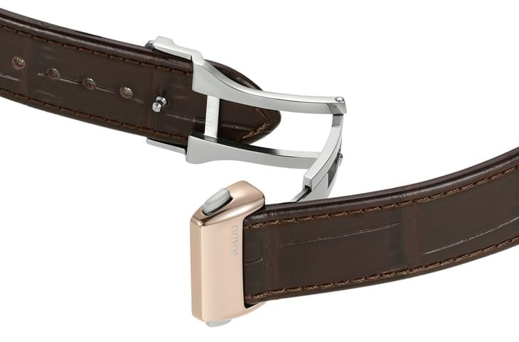 ▲手錶配置棕色皮革錶帶,搭上拋光鈦金屬可伸縮折疊錶扣以及拋光Ceramos™金屬陶瓷扣面。