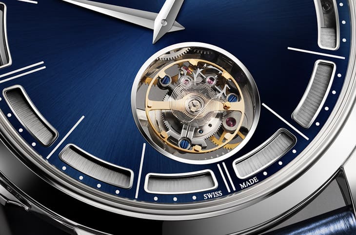 ▲同為白金錶殼的手錶換上深藍色錶帶和面盤,其中它的飛行陀飛輪經過特別設計並取得專利,讓擺輪得以加大並提升運作穩定性。