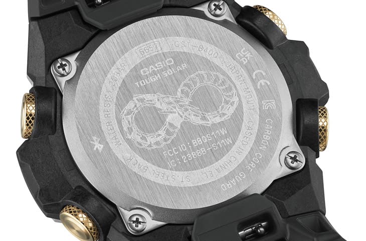 G-SHOCK在設計蛇年生肖錶時,靈感圍繞古代傳說中的「銜尾蛇」而生,這種蛇由於嘴巴咬著自己的咬巴,加上纏繞的身體剛好形成象徵無限與不朽的符號,用來呼應新年予人正向、希望的氛圍不謀而和。此外G-SHOCK還在錶款的按把、錶帶扣環以及面盤上,一一加上類似蛇鱗的裝飾圖案,搭配上手錶正面各處的金色細節,一方面展示出新年的喜慶感,同時也把生肖主題悄悄地融入整只錶中。