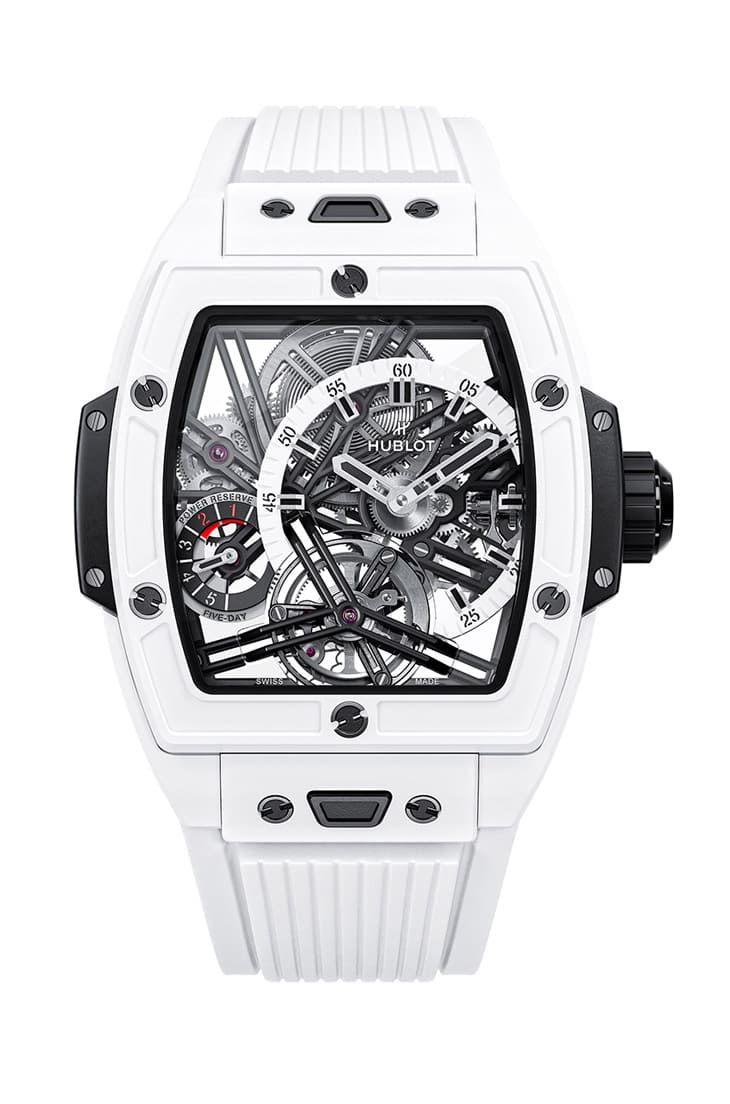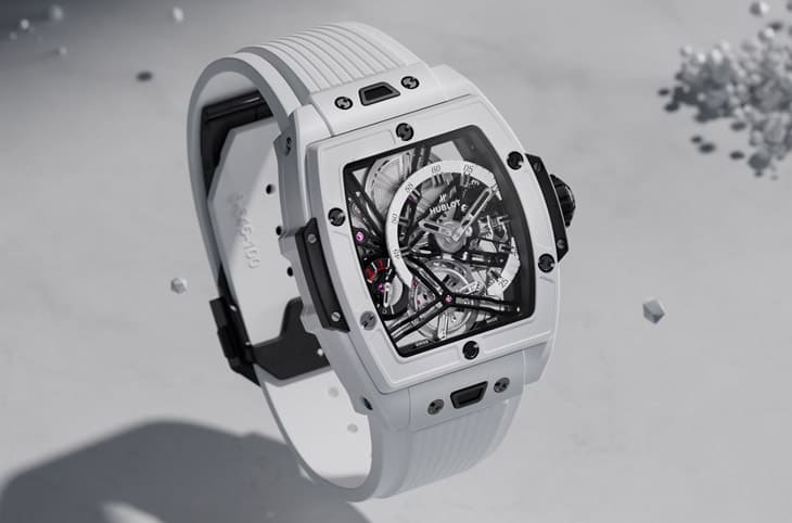 宇舶採用專利技術製作的白色陶瓷比起傳統陶瓷材質的優點不少,除了同樣輕盈、抗刮等,它的親膚性也很優異,加上維氏硬度被提高至1500HV1,想要在手錶的錶面製造出刮痕難度更高,提供手錶可靠的保護性。為了與白色陶瓷的顏色互搭,HUBLOT選了白色橡膠製作錶帶,錶帶上頭有立體的花紋,一方面有裝飾作用,而且也能因此在佩戴者出汗時,讓手腕保有一定的透氣程度,不會戴整天覺得悶熱濕潤。