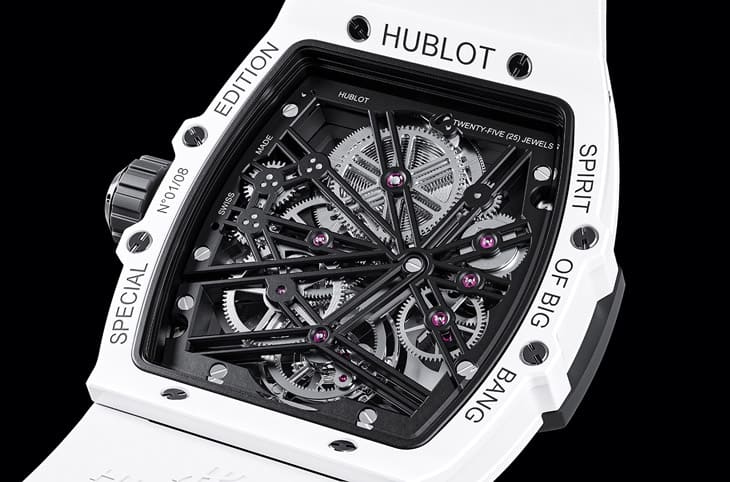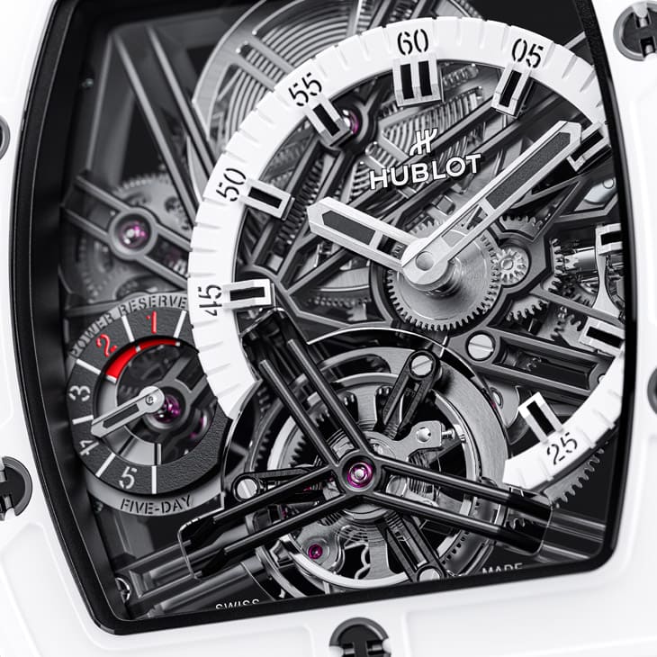 ▲宇舶改用白色陶瓷製作Spirit of Big Bang陀飛輪,手錶以白黑色對比展現俐落卻又複雜的巧妙設計。