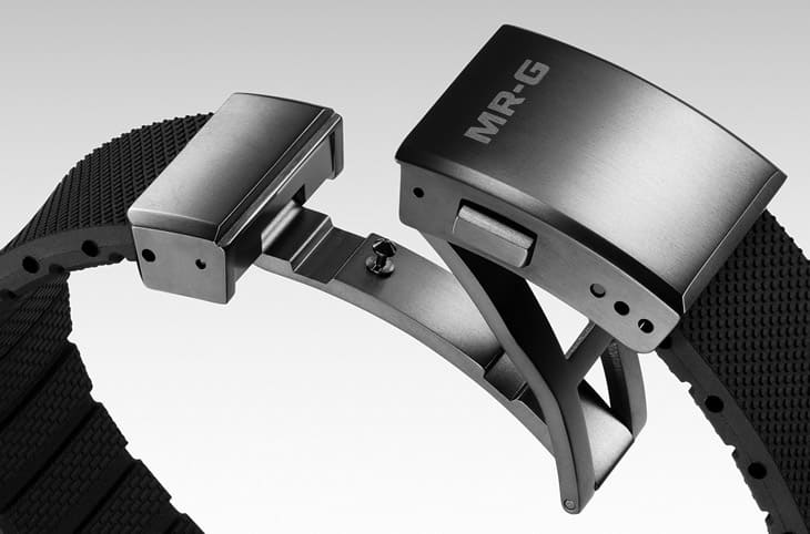去年MRG-B2100B-1A搭配的是經過鍍黑的鈦金屬鍊帶,2025年MRG-B2100R-2A則改用Dura Soft氟橡膠製作錶帶,其表面一方面揣摩鍊帶在兩節兩側加上螺帽般的裝飾,同時還在橡膠錶帶外表增添G-SHOCK手錶經典的磚紋紋理,讓錶帶材質轉換之際,視覺吸引力也能不減反增。
