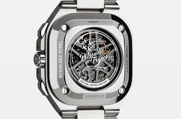 錶款搭載BR-CAL.326自動機芯,在印有法國巡邏兵飛行表演隊標誌以及手錶限量編號的透明底蓋下可以一窺機芯的結構,它的鏤空自動盤以全幅式設計替機芯帶來若隱若現的神祕感,BELL & ROSS於零件的修飾方面力求細緻,在此還能看見擒縱系統規律的運作。BR-CAL.326機芯的擺輪震頻為4Hz、動力儲存也有60小時,結合其100米防水性能,日常生活佩戴綽綽有餘。