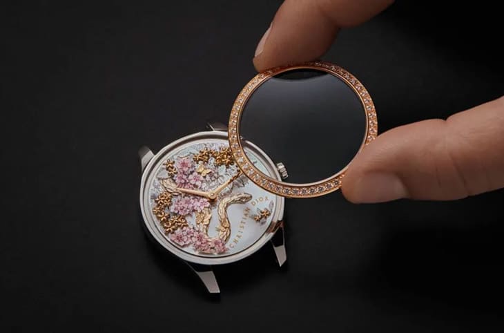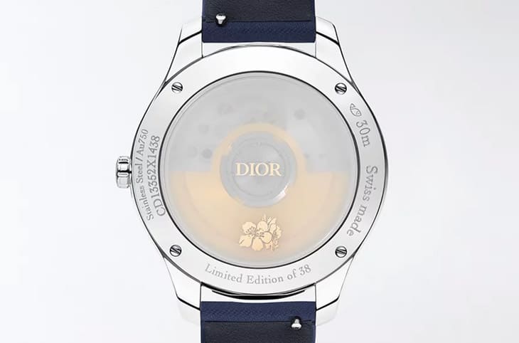 ▲錶背霧面透明底蓋讓機芯呈現若隱若現效果,其上印有金色的迪奧字樣以及花卉圖案,底蓋下緣更刻有手錶稀有的限量數目。