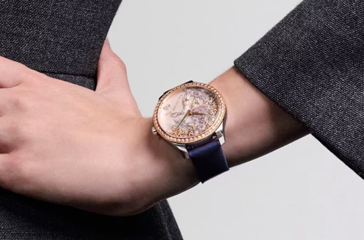 不鏽鋼、玫瑰金材質/Sellita SW300自動上鍊機芯/時、分顯示/珍珠母貝面盤點綴層次珍珠母貝雕刻花朵、樹葉Toile de Jouy法式印花圖騰,蛋白石靈蛇點綴玫瑰金細節與18K金花朵與蝴蝶/錶圈鑲鑽52顆,約重1.3克拉、錶扣鑲鑽18顆,約重0.18克拉/防水30米/錶徑36mm/限量38只/參考價:NT$ 1,450,000