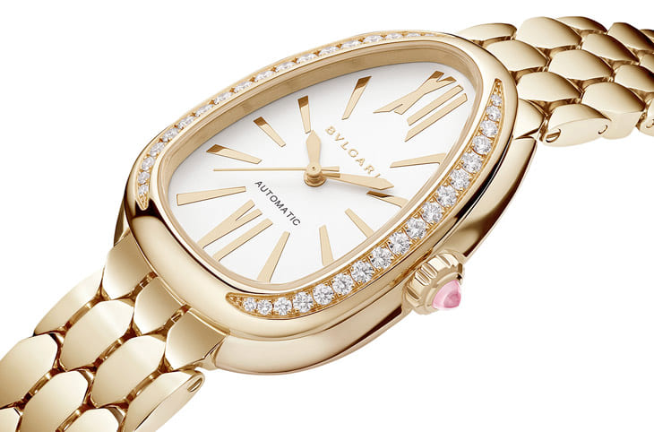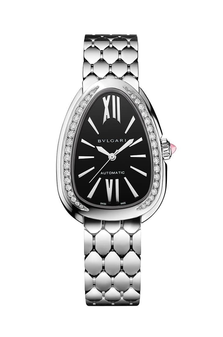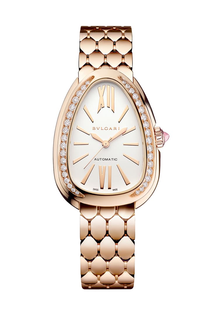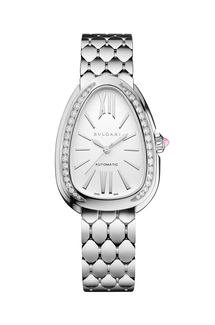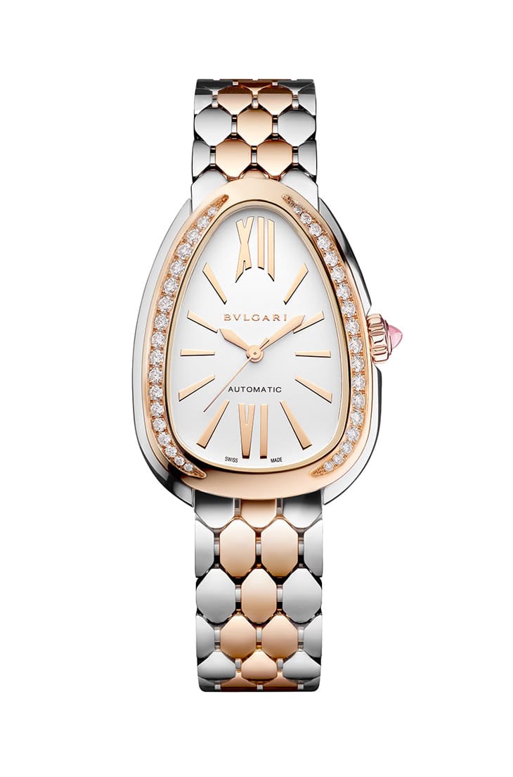 搭載寶格麗全新開發自動機芯的是一系列Serpenti Seduttori以及Serpenti Tubogas手錶,它們的尺寸介於34與35mm,並運用不鏽鋼、黃金、玫瑰金與白金等材質交織出豐富的產品陣容,其中有的款式還是用不鏽鋼搭配貴金屬形成雙色組合,而每種款式的錶殼兩側也都會鑲有數十顆大小鑽石鋪陳出類似蛇形的輪廓。新作的錶殼輪廓經過調整、錶冠造型也有微調,其上並鑲嵌蛋面切割粉紅碧璽呼應女性的婉約氣質;無論採用什麼金屬打造,全新Serpenti Seduttori手錶一律搭配六角形蛇鱗鍊節拼接組成的鍊帶,Serpenti Tubogas手錶則是擁有手環式的單圈或雙圈鍊帶,搭配蛇首造型般的錶殼詮釋出逼真的靈蛇意象。