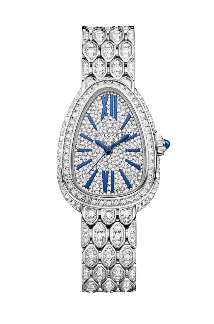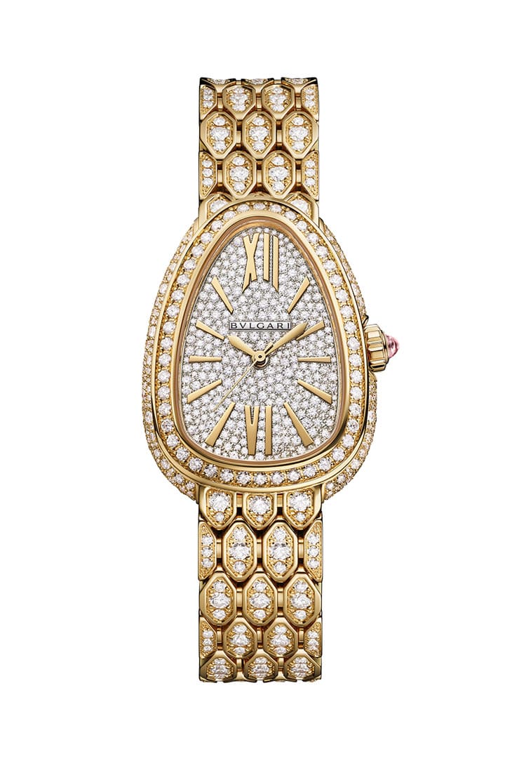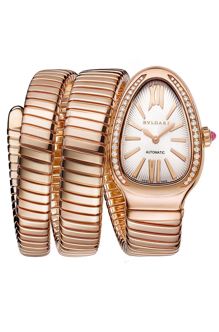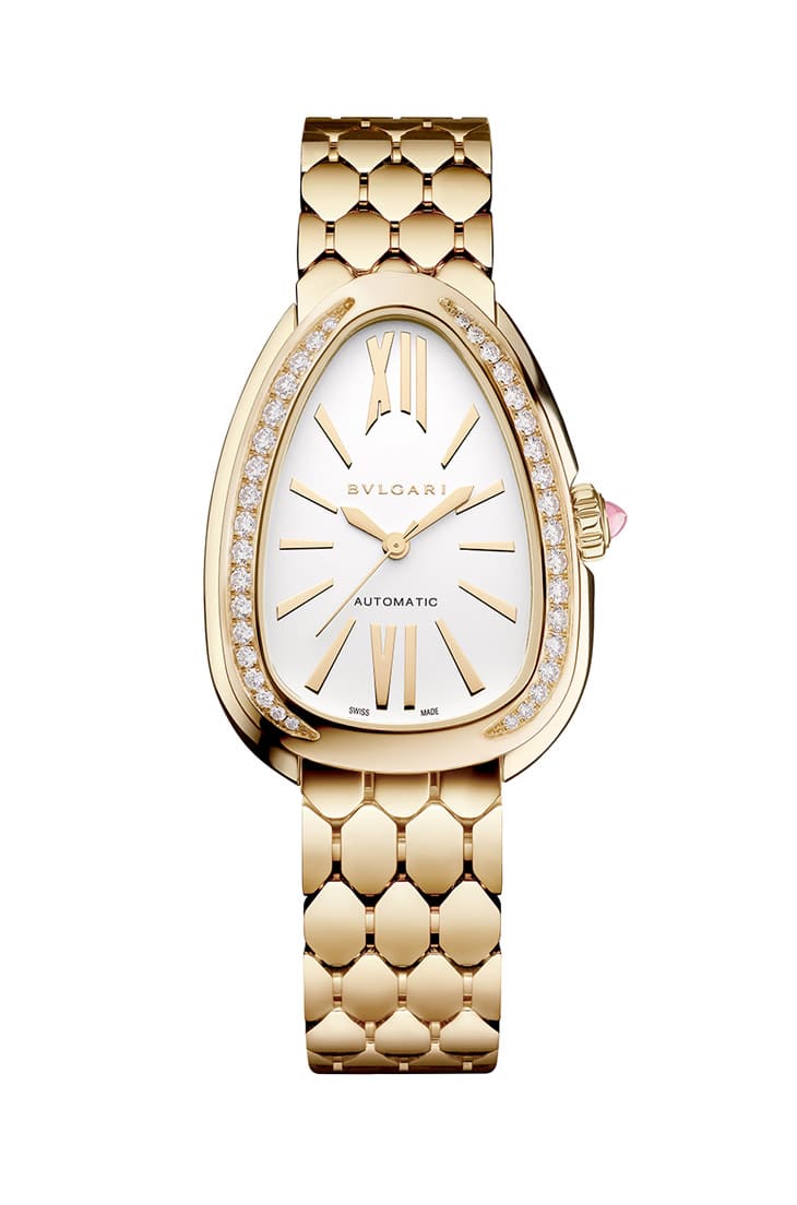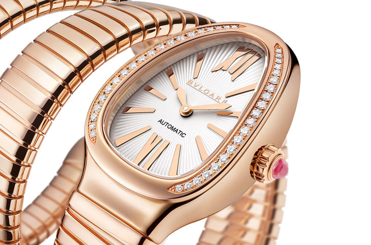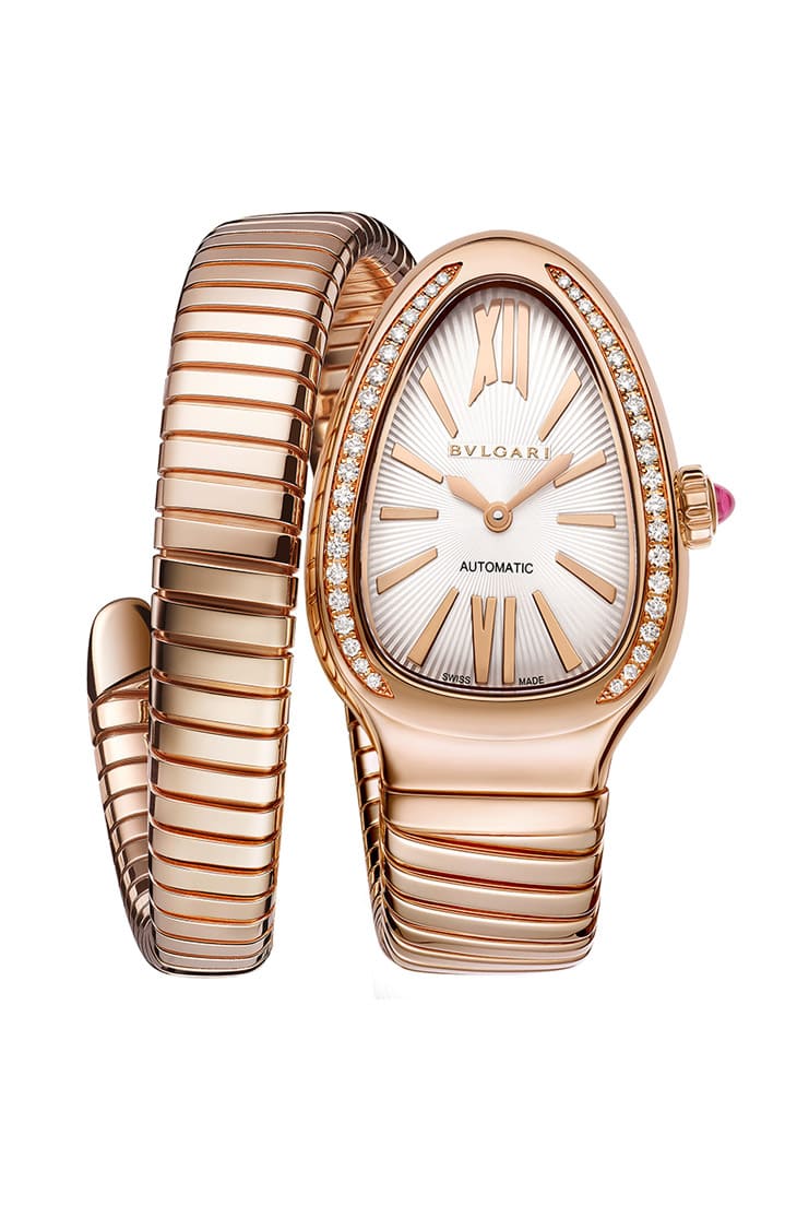 搭載寶格麗全新開發自動機芯的是一系列Serpenti Seduttori以及Serpenti Tubogas手錶,它們的尺寸介於34與35mm,並運用不鏽鋼、黃金、玫瑰金與白金等材質交織出豐富的產品陣容,其中有的款式還是用不鏽鋼搭配貴金屬形成雙色組合,而每種款式的錶殼兩側也都會鑲有數十顆大小鑽石鋪陳出類似蛇形的輪廓。新作的錶殼輪廓經過調整、錶冠造型也有微調,其上並鑲嵌蛋面切割粉紅碧璽呼應女性的婉約氣質;無論採用什麼金屬打造,全新Serpenti Seduttori手錶一律搭配六角形蛇鱗鍊節拼接組成的鍊帶,Serpenti Tubogas手錶則是擁有手環式的單圈或雙圈鍊帶,搭配蛇首造型般的錶殼詮釋出逼真的靈蛇意象。