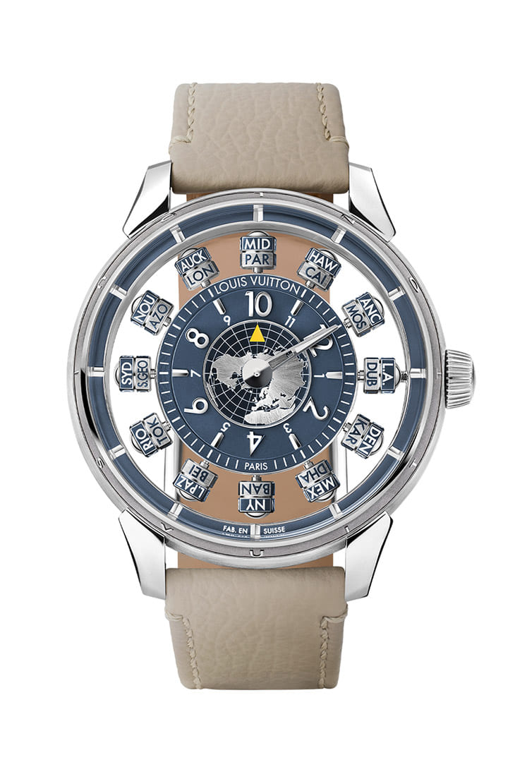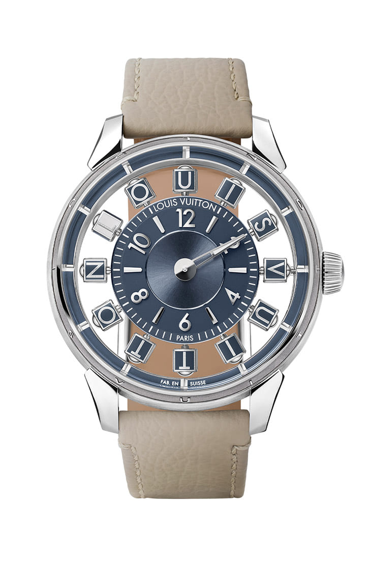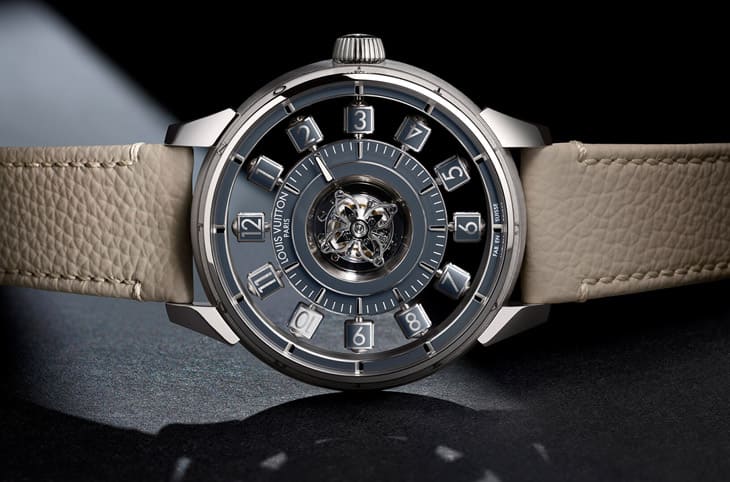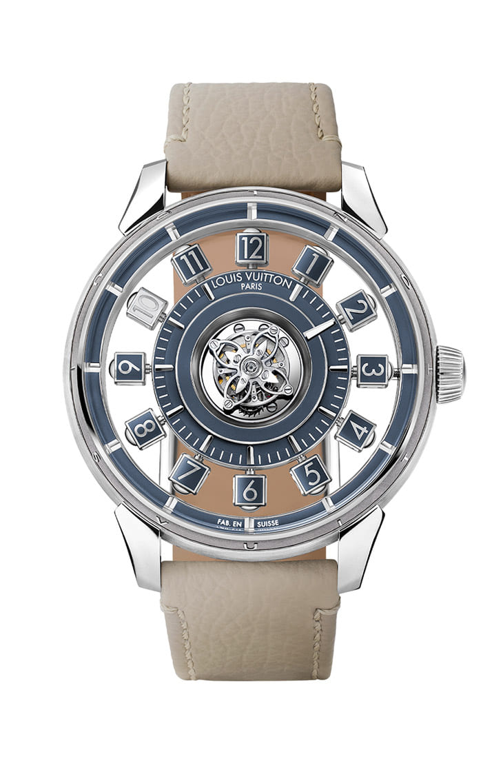 路易威登在2009年首度研發出Spin Time機制,其由La Fabrique du Temps創辦人Michel Navas和Enrico Barbasini構思而成,據說靈感來自歐洲火車站的那種翻頁顯示器。2025年Spin Time機制藉由Tambour Taiko Spin Time系列重生,此系列一登場就囊括了6款限量錶,尺寸分別有39.5mm與42.5mm,可由前者配置實底蓋、後者配置透明底蓋粗略分辨,兩種尺寸都沿用相同的Tambour Taiko錶殼造型(以日本太鼓Taiko為名),而且一律以白金材質製作。系列中的作品可再分成四種款式,分別是顯示時、分的Tambour Taiko Spin Time手錶、顯示時、分且帶有鏤空設計的Tambour Taiko Spin Time Air手錶、增添世界時區顯示的鏤空Tambour Taiko Spin Time Air Antipode手錶,以及目前系列最高規格的Tambour Taiko Spin Time Air Antipode陀飛輪等,這些Spin Time手錶雖然有的是實心面盤、有的是鏤空面盤,但它們的翻轉小時方塊皆為海豚灰色調(顯示當下小時那一面則是銀色),每當整點一到,佩戴者就能欣賞到兩個小時方塊同時跳轉——先前的小時消失,換成當下小時翻面現身,讓人看得嘖嘖稱奇。