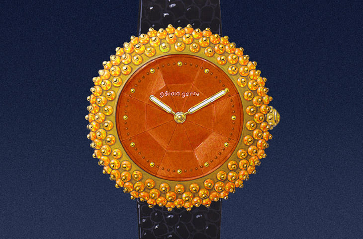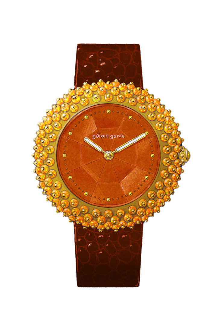 這款是Gentissima Oursin系列的第四件作品,手錶採用黃金製作,外圍別出心裁地個別固定火蛋白石,具體來說是用137顆黃金針鎖定的火蛋白石來裝飾黃金錶殼,火蛋白石來自墨西哥各地火山的深處,水分在那裡被熔岩困住,賦予蛋白石獨特的黃色、橘色或紅色,這種複雜寶石由一種讓地質學家困惑不解達數世紀之久的獨特化學成分所構成,具有能提升創意和自信的象徵意涵。手錶面盤以橘色紅玉髓打造,並具備GERALD GENTA時計招牌的刻面晶體形狀,這種形狀也出現在錶殼最內側、帶有一點八角形的邊緣,展現創辦人對有機色彩、美麗寶石以及廣義美學的熱愛。