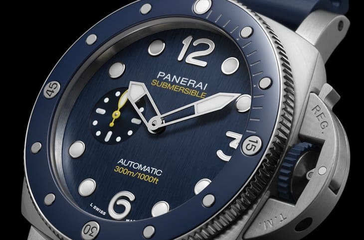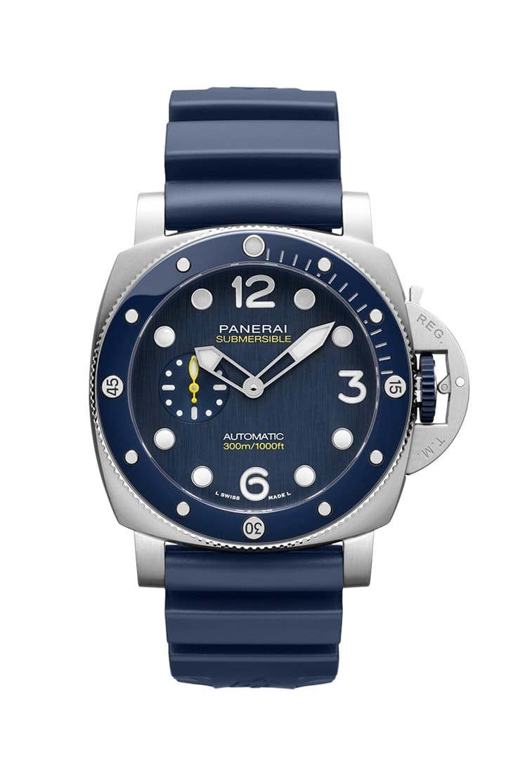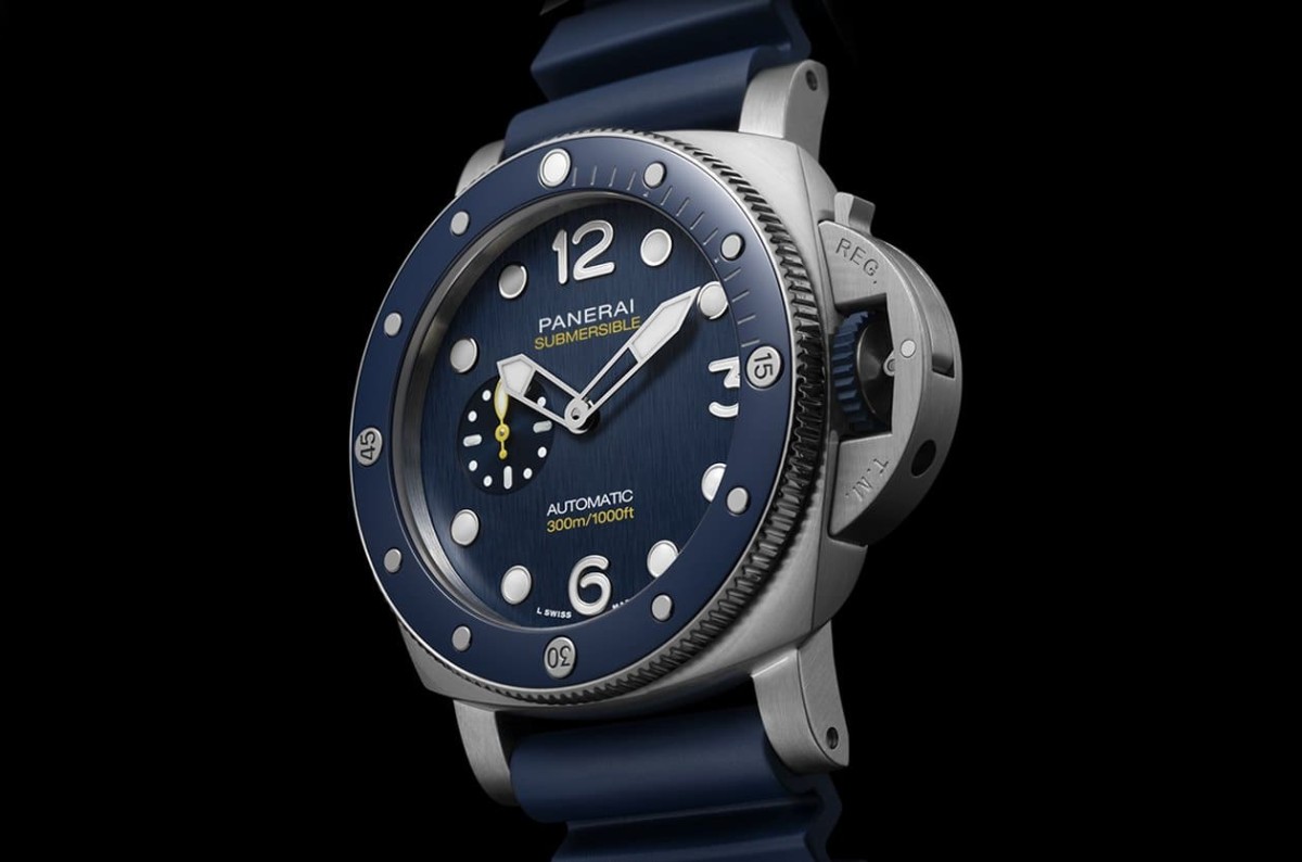 ▲PAM01676以不鏽鋼材質搭配藍色陶瓷錶圈,藍色面盤經過垂直磨砂處理,洗鍊呈現Submersible的強大運動機能。