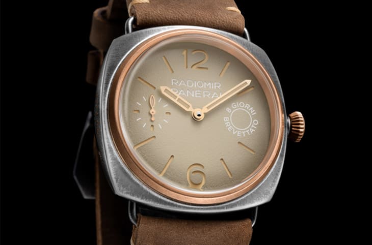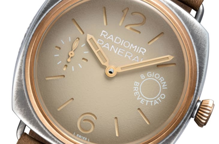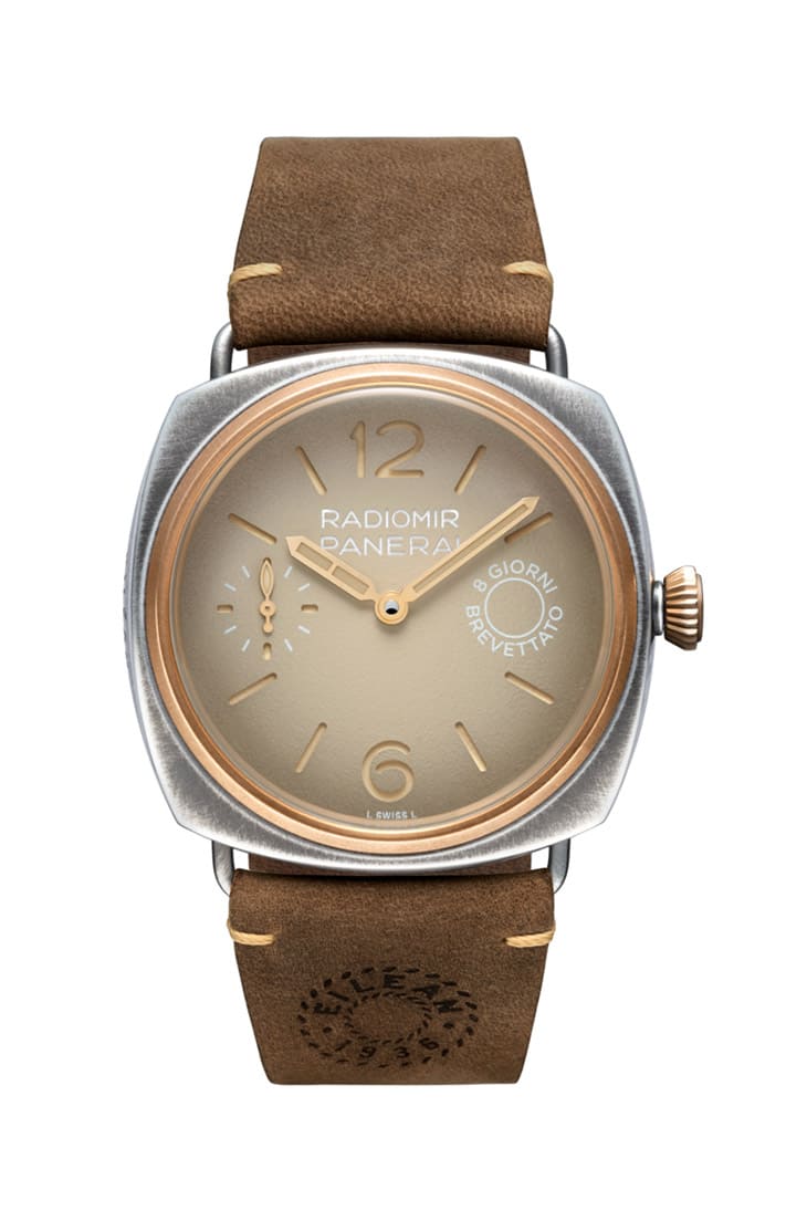 PAM01643的三明治面盤採用米色粒紋設計,靈感源自Eilean號的風帆,包括三明治夾層的Super-LumiNova® X1夜光塗層也是米色調,搭配金色指針洋溢高雅復古的風格,至於面盤12點方向與3點方向的品牌、系列字樣,以及明示手錶動力儲存空間的"8 GIORNI BREVETTATO"(義大利文,意指「八日動力」)標誌等又都是白色,在米色面盤上看起來清楚又俐落。