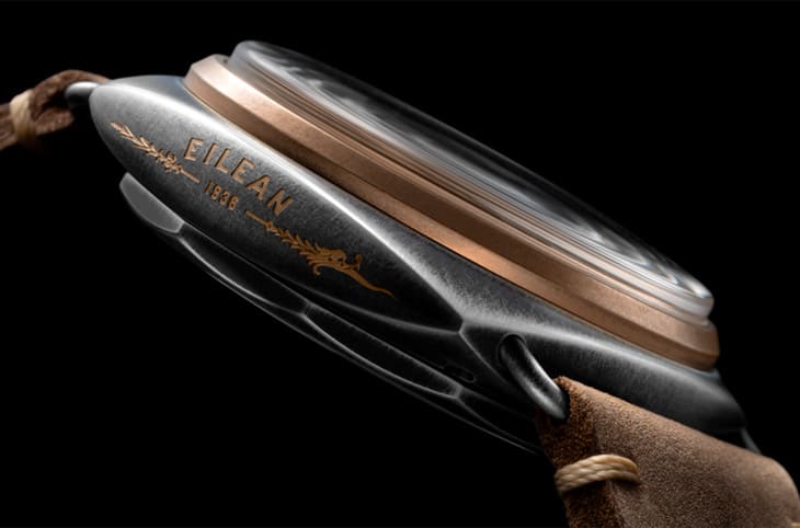 ▲採用Brunito不鏽鋼與青銅材質製作的錶殼富有陳舊效果,錶側另刻有Eilean號帆船的龍形徽章裝飾。