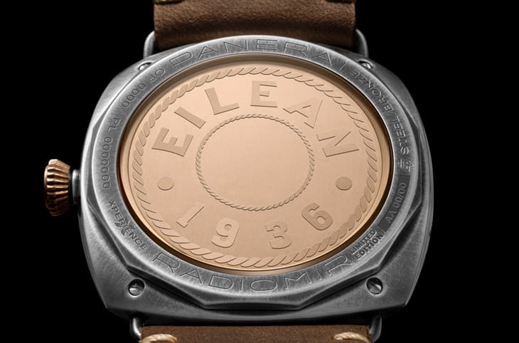 由兩種材質構成的錶頭,搭配沛納海配置的深棕色皮革錶帶盡顯優雅紳士風範,值得一提的是,錶帶上還壓印紀念 Eilean號首航年份1936的圖案,藉以彰顯出手錶與Eilean號帆船之間的淵源。同時若注意到錶殼左側部分,還會發現Eilean號帆船船身代表性的龍形徽章裝飾,其以陰刻方式塑形,並填入金色顏料,與錶圈的青銅材質也有彼此呼應的味道。