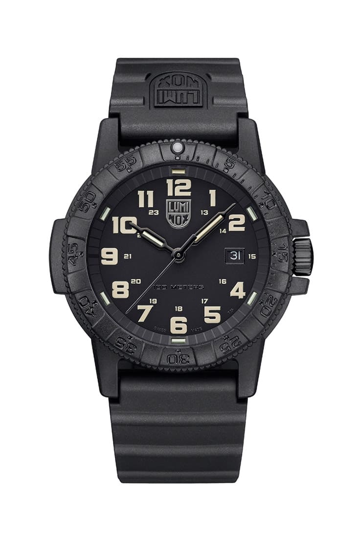 美國平價品牌雷明時是運動錶專業戶,他們家的錶很多都是走全黑風格,同時像3000系列這樣的作品更標榜符合美國海豹突擊隊所需而生。LUMINOX海洋系列中的入門作品Leatherback Sea Turtle就是一款全黑造型的作品,它的錶殼、底蓋和錶圈皆是用碳纖維複合材質製成,因此手錶重量僅50公克,相當輕盈。手錶配置黑色面盤,其阿拉伯數字時標為沙色Super LumiNova夜光材質,另在指針與面盤外圍部分刻度裝上氚氣燈管,呈現出強大的夜視效果,功能性則是基本的三針加日期,錶款搭載Ronda 515石英機芯雖然沒有像機械機芯有較高的賞玩性,但它的走時精準度還是較高,而且採用石英機芯也壓低了製作成本,這便反映在手錶超親切的價格上。