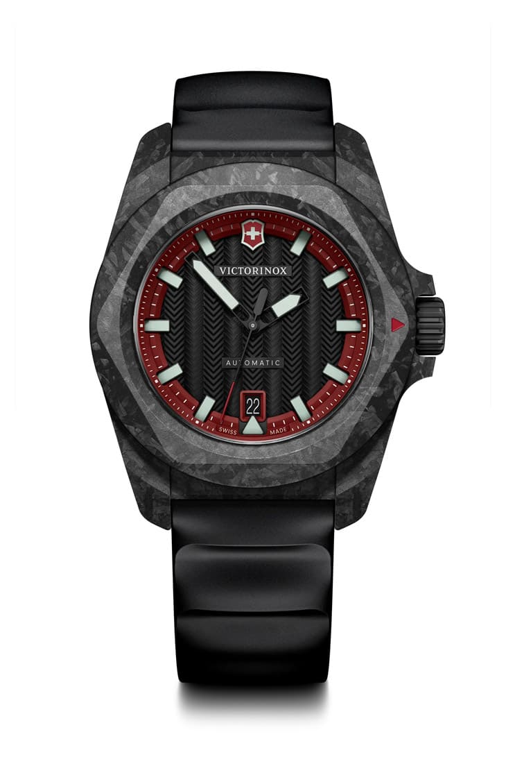 以生產瑞士軍刀著名的VICTORINOX 2024年適逢人氣運動錶作品I.N.O.X.邁入10週年,因而重新打造新世代作品,其中便包含以碳纖維製作錶殼與錶圈的高規版I.N.O.X. Automatic。碳纖維的不規則紋路讓線條粗獷的手錶戴起來意外的輕盈(手錶重量為85克),同時也充滿了視覺的獨特性,而且它的黑色面盤還換上了致敬瑞士雄偉的山脈的人字紋,與不鏽鋼版本I.N.O.X. Automatic面盤採用的Alox鋼紋做出區隔。手錶的防水性能達到200米,並且避震效能也達到ISO 1413標準等級,加上內部的Sellita自動機芯,自有令人滿意的可靠品質。碳纖維錶殼的I.N.O.X. Automatic這款黑面、酒紅色刻度款式為限量版,錶盒中附上瑞士軍刀和附橡膠錶,配備為此款中最齊全的旗艦作。