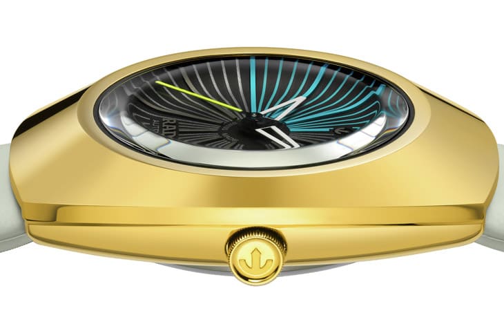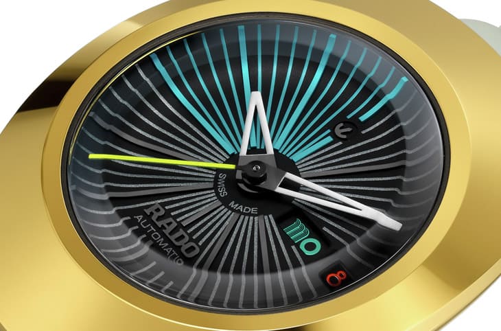 一如上次RADO和Tej Chauhan打造True Square特別版的手法,DiaStar Original特別版的面盤也帶有黑色霧面效果,其中45~60刻度(抑或9-12點)延伸的線條為藍色,其餘則是灰色,同時藍寶石水晶鏡面則是刻成放射狀造型,此外3點方向的日期與星期顯示分別為黑底紅字,以及黑底綠色,而鏤空的時、分指針為白色、線型秒針又是螢光黃色,正是這種繽紛多彩的集合,加上放射狀線條的輔助,使手錶散發出簡潔俐落的未來風格,就連指針軸心下方的"SWISS MADE"字樣出現在那也頗具打破傳統思維的創意。值得一提的是,日期與星期顯示的字體都出自Tej Chauhan創作的字體,手錶雖然正面看不出與設計師的直接關聯,但是透過細節的巧思,還就不著痕跡地將設計師的個人風格巧妙注入。