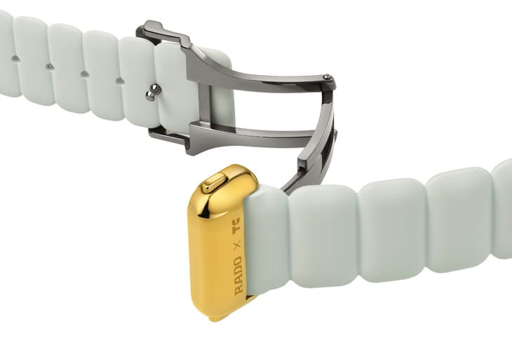 DiaStar Original鑽星 X Tej Chauhan特別版以黃金PVD覆蓋著不鏽鋼錶殼、錶冠,以及Ceramos™金屬陶瓷錶圈,雖為異材質組合,但是兩者的視覺效果卻能趨於一致,另外手錶此次配置的是灰色枕形橡膠錶帶,如此形形塑的色彩衝擊感相對強烈,而且錶帶又有可伸縮折疊錶扣,能夠視佩戴者手腕尺寸加以微調,帶來更舒適的佩戴體驗。