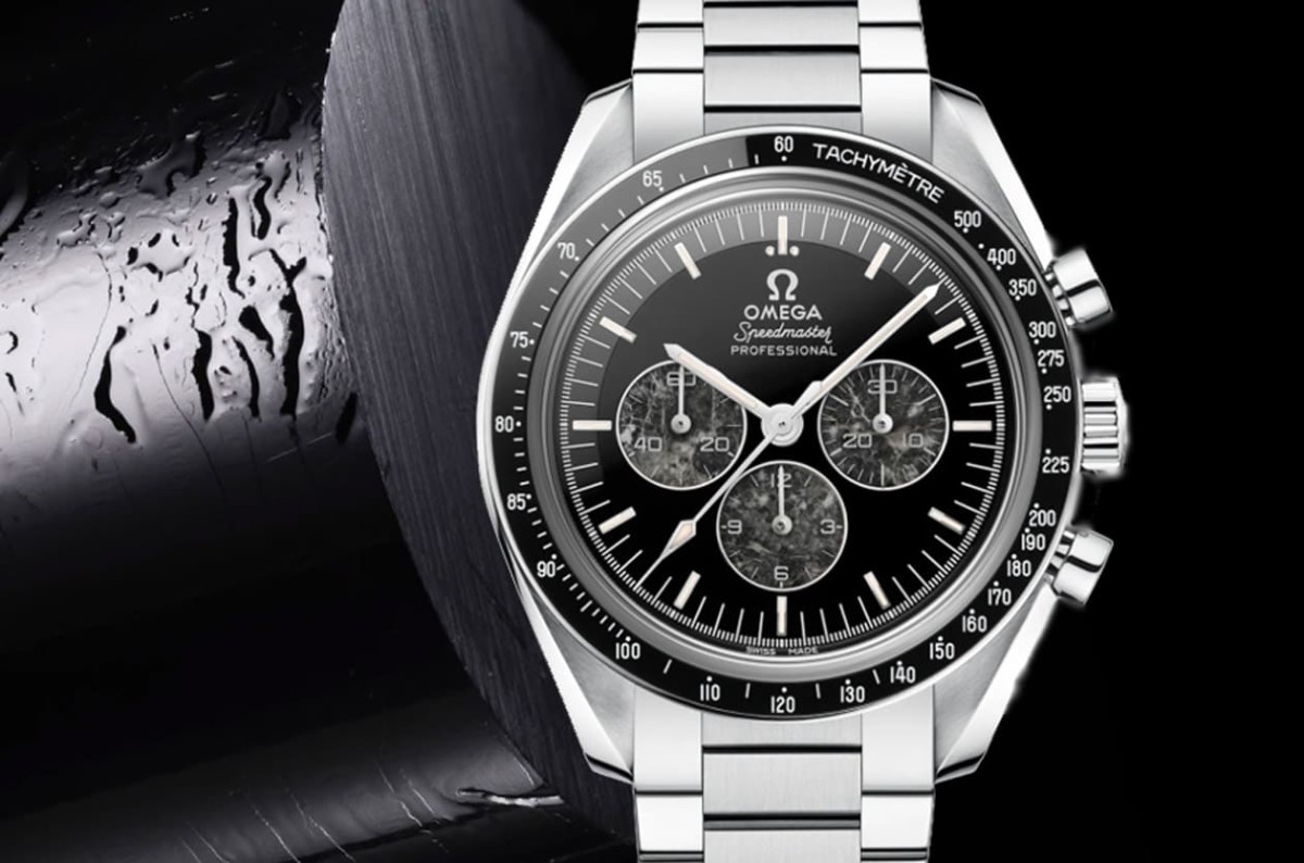 新款超霸計時碼錶延續了前作設計,採用黑色縞瑪瑙面盤,搭配灰色月球隕石製成的小錶盤,而時標、指針和復古的"Ω" Logo均採用18K白金製成,其中時標和指針都塗有Super-LumiNova夜光塗層,確保手錶在昏暗環境下的易讀性。