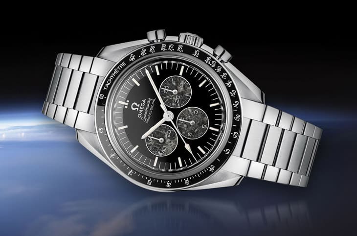 ▲黑色縞瑪瑙面盤上的三枚小錶盤以月球隕石製成,呼應超霸系列與登月任務的淵源。