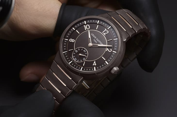 Tambour Ceramic以棕色陶瓷和玫瑰金材質異材質組成,雖然錶殼、鍊帶大部分材質還是陶瓷,不過其中也夾帶著玫瑰金材質低調烘托手錶的高級感。這款作品的部分鍊帶鍊節與錶背等處採用玫瑰家材質,其實它的結構頗為複雜,有點像是陶瓷包著玫瑰金,而且陶瓷表面的作工和修飾完全比照先前推出的新生代Tambour,例如錶冠有刻槽、錶圈側面刻有LOUIS VUITTON字母,而且錶殼、錶圈與鍊帶分別經過緞面、拋光和噴砂等處理,在高硬度的陶瓷上做出如此繁複的加工,從中展現出路易威登的製錶實力。