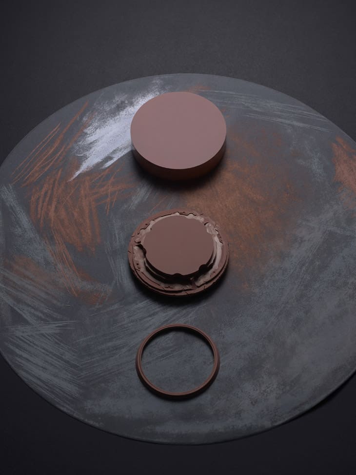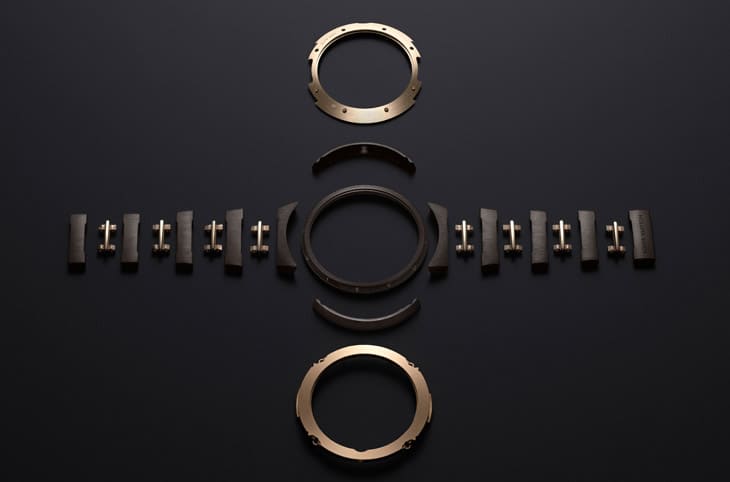 LOUIS VUITTON用於製作Tambour Ceramic的陶瓷材質成分即是二氧化鋯(ZrO2),通常我們看到的陶瓷錶殼往往是白色或黑色,不過路易威登旗下La Fabrique du Temps工坊為了建立風格,精心將陶瓷調配出棕色調。Tambour Ceramic的陶瓷零件並非使用鑄模成形,而是透過高科技加工技術配合製錶師手工修飾,以達到精準的幾何形狀。此過程始於陶瓷粗塊的加工,由於陶瓷非常硬,加工過程也更為困難。透過高溫燒製陶瓷塊並精心控制收縮率,以達到正確的色澤與尺寸,之後陶瓷零件會再次進行加工,以高精密度完成符合設計的形狀和尺寸,然後就是前面提到的要經過不同裝飾工藝處理,讓手錶的手工製作質感突顯,並與單純靠著震動研磨製程塑造的效果產生區隔。