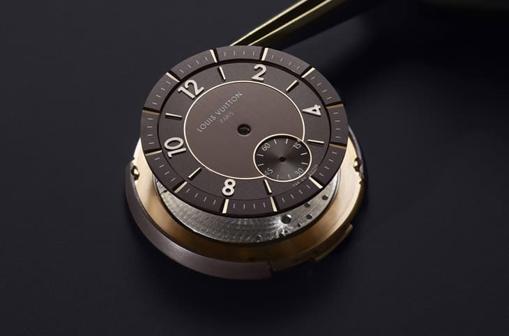 ▲與錶殼一致,面盤也同樣是棕色調,而且路易威登還在面盤不同區域施加各種裝飾工藝展現豐富層次。