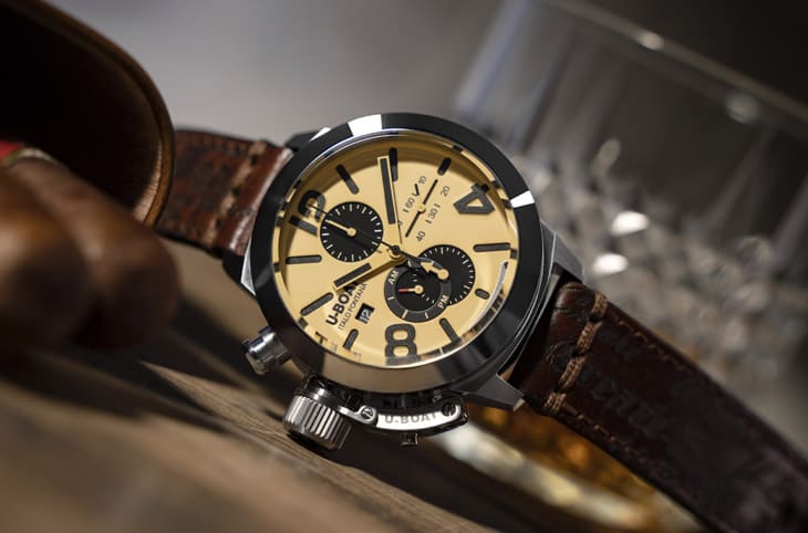 ▲U-BOAT往往將錶冠設置在左側,伴隨大錶徑、手工皮帶等特色而自成一格。