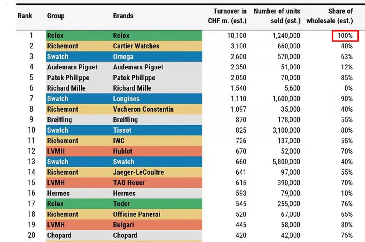 ▲對照2023年(上)和2024年(下)版本的大摩瑞士鐘錶產業年度報告,會發現勞力士去年的經銷商銷售佔比竟然少了8%。Source:LuxeConsult, Morgan Stanley