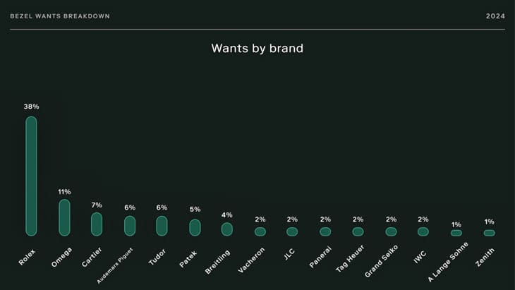 不過有時候想要和實際出手時的選擇不見得完全一致,Bezel除了調查市場想要的是什麼,也從自己網站上的銷售記錄來尋找現實的答案,結果在2024年於該平台上交易量最高的手錶品牌仍是勞力士,其以36%傲視群雄,僅次於ROLEX的2、3名分別是歐米茄(14%)和帝舵(12%)。值得一提的是,在Bezel的銷售資料中,小型錶廠和小眾品牌的佔比加起來也達到15%左右,顯見品牌名聲固然是銷售時的基本保證,但市場也不乏對於獨特、創新產品的高度興趣。