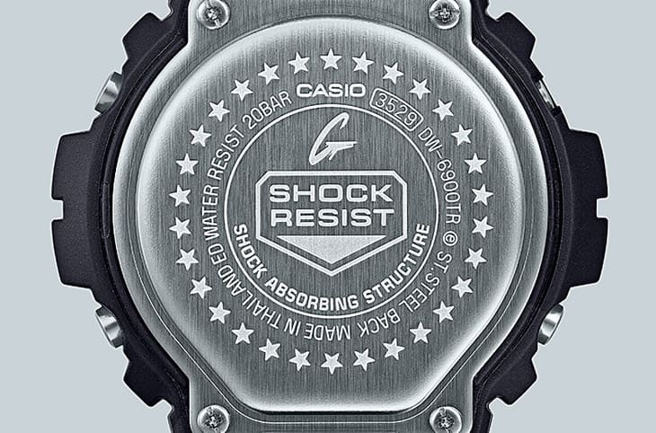 同樣的慶祝週年邏輯也延續到錶背底蓋上,在G-SHOCK手錶常見的文字說明以外,還加上了多達30顆星星圖案,用一顆星代表一年,滿滿30顆星星圍繞底蓋外緣,展現出DW-6900系列隨著時間愈陳愈香的經典款地位。DW-6900TR這種紀念款的錶盒當然也是一大亮點,其以黑色為主色,搭配紅、黃兩色彰顯G字標誌,另外也還印上"30th ANNIV."字樣,清楚交代復刻作品的創作緣由與收藏意義。