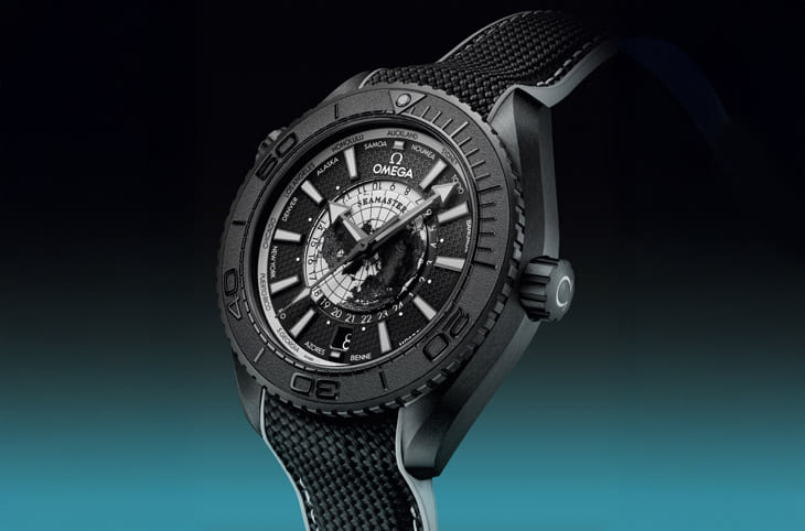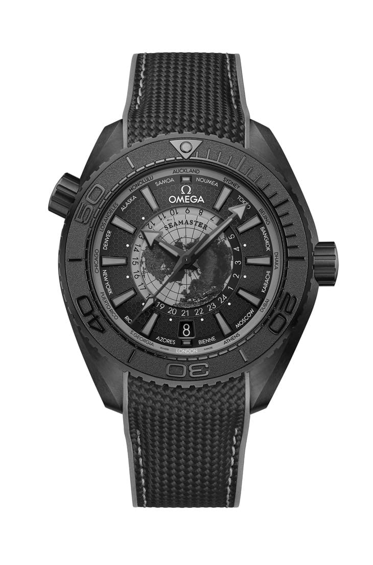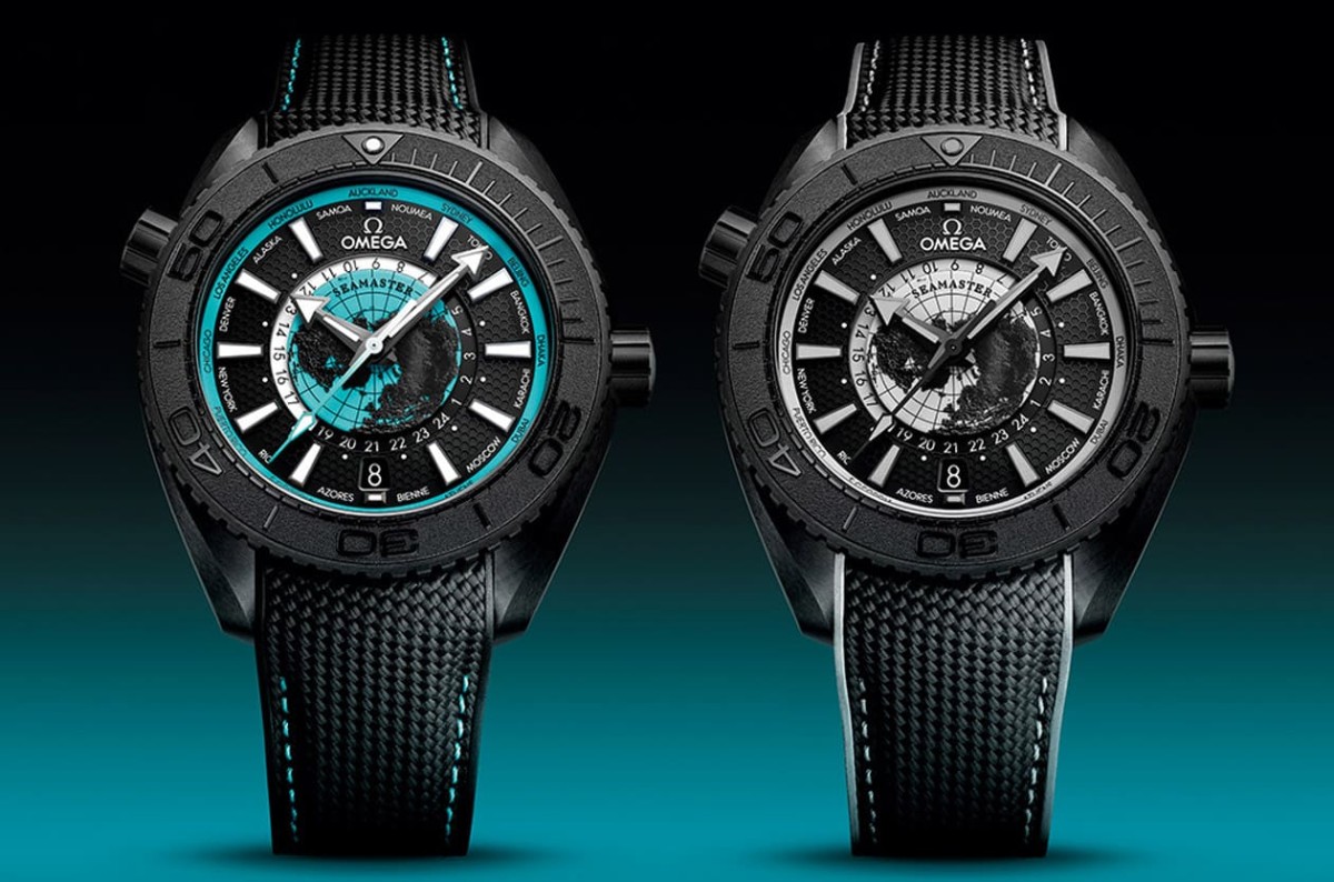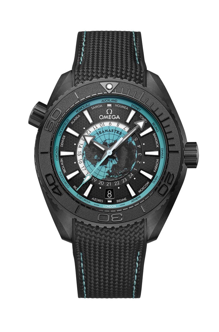 海馬Planet Ocean世界時區手錶採用黑色陶瓷製作,錶徑維持Planet Ocean一族標準的45.5mm,歐米茄分別推出兩款,它們都奠基於Planet Ocean Deep Black的全黑風格,不過有一款融入OMEGA近年蠻常使用、也頗受市場後的綠松石色細節,因此兩款錶在相同的設計架構下,得以散發出各自的獨特性。