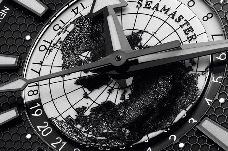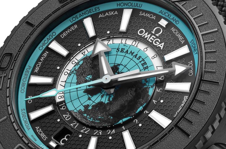 海馬Planet Ocean世界時區手錶的面盤一方面和Aqua Terra世界時間手錶一脈相承,但歐米茄也針對手錶的特質重新調整過細節。相似之處如面盤外側有代表全球24個時區的世界主要城市名稱環、面盤中央則有以雷射蝕刻與清漆工藝製程的北極俯瞰視角世界地圖,兩款海馬Planet Ocean世界時區手錶的立體地圖都是黑色,而下方的經緯線圖案則分別為灰色或綠松石色,在這幅地圖外圍的的是24小時刻度,其中全黑款的刻度分為灰、黑兩色,綠松石色款則改用白、黑兩色代表晝夜之分。