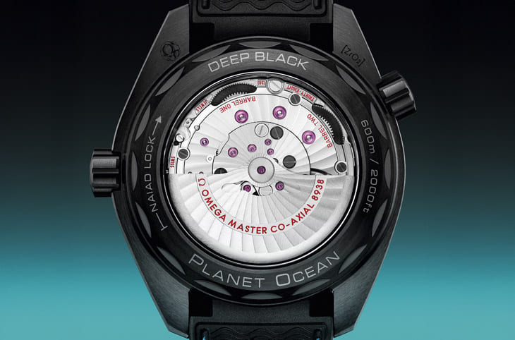 錶款背面的透明底蓋邊緣同樣是黑色的Naiad Lock零件,它們均沿用Aqua Terra世界時間手錶的8938自動機芯,這枚機芯的自動盤、底板與擺輪橋板均有蔓藤花紋飾日內瓦波紋,零件邊緣也有倒角拋光處理,整體顯得統一而和諧。機芯規格還是維持3.5Hz震頻,動力儲存60小時以歐米茄機芯而言相對長效,而且它也通過大師天文台認證,確保抗磁性能達到15,000高斯以上,其他各方面的規格也都符合檢測標準,對於一款功能更上層樓的複雜機芯而言,8938機芯的品質在同級對手中顯得競爭力十足。