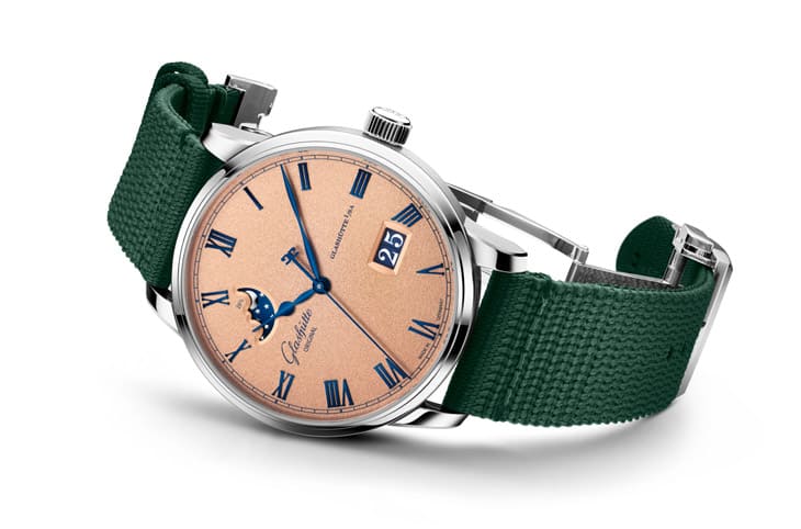 錶款搭載的是Calibre 36-24自動機芯,除了有大日期加上月相等進階功能,這枚機芯的規格本身也很有料,例如其蘊含矽游絲,帶來抗磁、耐腐蝕與抗溫差效果,同時它還有經過優化的大直徑發條盒,一舉促成手錶達到100小時長動能。甚至在手錶出廠前,都需要先經過24天的各項檢測,確保手錶品質無虞才能進入到交付消費者的階段;一如前面提到的職人匠心,有透明底蓋的好處就在於可以好好欣賞格拉蘇蒂原創細緻雕琢後的機芯樣貌,你可能會覺得精工細作的機芯打磨視覺效果還比面盤的簡潔設計更有味道,這也是德國製錶工藝讓人津津樂道的招牌優點。