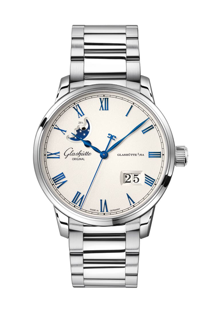 ▲格拉蘇蒂原創打造兩款議員卓越大日期月相錶,其皆以不鏽鋼製作,但是面盤顏色各有各的魅力。