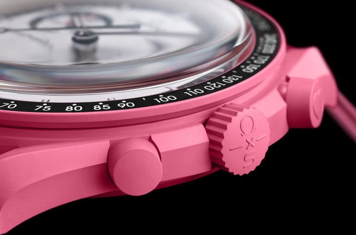 ▲錶款以粉紅色生物陶瓷材質製作,錶冠印有OMEGA x SWATCH兩大品牌聯名標誌。
