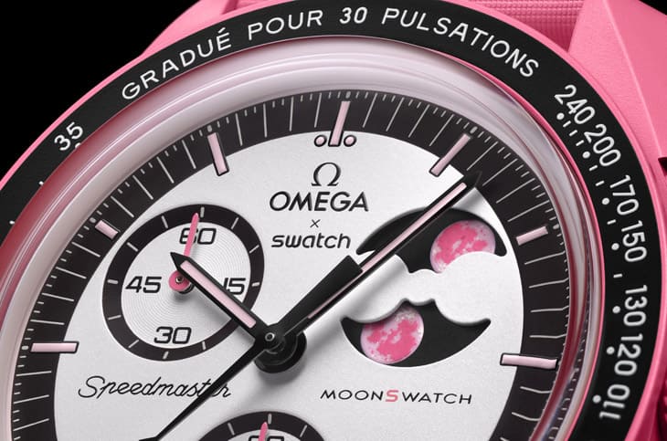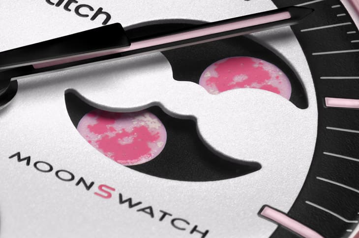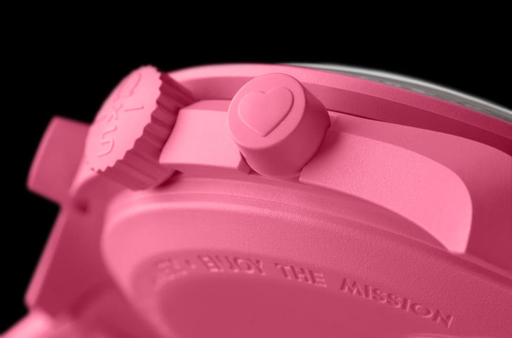 Mission to the Pink Moonphase外觀以粉紅色的Bioceramic生物陶瓷製成,搭配粉紅色VELCRO®️錶帶塑造出超級搶眼的外型,這點倒是和迷你滿月時月亮變得較黯淡的情況有所不同,SWATCH反而是放大了粉紅月亮的色彩魅力,成就出這系列錶作最大膽的視覺印象。手錶的黑色錶圈上維持著如同Mission to the Super Blue Moonphase的脈搏計刻度,從刻度上的標示與數字可知,佩戴者能以心跳或脈搏30下為單位:啟動計時功能後心算自己的心跳或脈搏數達到30下後即停止計時功能,如此一來計時秒針所指的刻度即為佩戴者每分鐘的心跳或脈搏數(BPM),讓人可以隨時了解自己的身體狀況;有意思的是,SWATCH為了強調脈搏計功能,特別在2點方向的計時按把加上一個愛心壓花圖案,用以連結手錶的附加功能。