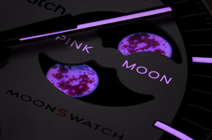 除了前述各細節的夜光塗層之外,SWATCH亦在呈現∞形的月相遮罩上巧巧添上隱藏塗層,這部分平常看不到,但是在紫外光照射下,遮罩上就會出現紫色的"PINK MOON"字樣,搭配面盤本身的夜光效果,讓手錶在光線明暗之處呈現出兩種樣貌。