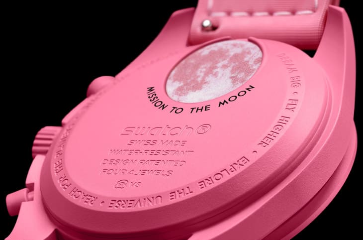 手錶背面同為粉紅色的生物陶瓷底蓋,電池蓋的下緣仍舊印上黑色的Mission to the Moon字樣,但是電池蓋上的月球圖案順應手錶主題改成了粉紅月亮版本,看起來洋溢春天粉嫩的氣息讓人驚豔。因為SWATCH在2025年替MoonSwatch開發了可替換的錶帶產品,也因此新近問世的MoonSwatch紛紛採用錶帶快拆系統,方便佩戴者想要更換錶帶時可以靠自己輕鬆搞定。