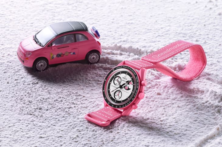 至於前文提到Mission to the Pink Moonphase新的發售方式,SWATCH將之前會載著MoonSwatch在全球各地跑透透的Rolling Planet主題車客製出小汽車模型,這次SWATCH沒有先公佈手錶的發售店點,而是希望錶迷們有空多關注SWATCH的社群平台,如此就能跟著迷你版的Rolling Planet主題車路線找到Mission to the Pink Moonphase會在哪開賣,而一如既往,就算事前還不知道哪家店會販售,等到實際販售點公佈出來後,當天每人在每個銷售店家還是只能限購一只Mission to the Pink Moonphase,對於MoonSwatch的忠實粉絲而言,這項規則早已不陌生。錶款預計在2025年4月1日起公佈迷你版Rolling Planet主題車的蹤跡,只有在店裡出現這台小汽車的情況下,才能在該店中買到這款色彩鮮豔的最新MoonSwatch。
