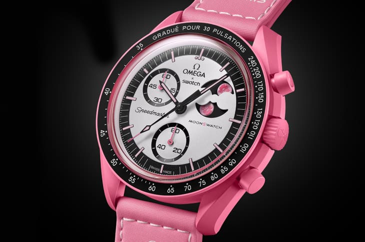SWATCH近日剛發表最新的Bioceramic MoonSwatch Mission to the Pink Moonphase,也就是受到4月滿月被暱稱為「粉紅月亮」所啟發而催生的MoonSwatch月相計時碼錶,這款作品有別於過往的MoonSwatch,換上大膽明豔的粉紅色生物陶瓷錶殼和粉紅色VELCRO®️錶帶,甚至2點方向的計時按把上還壓印一個愛心圖案(呼應手錶的脈搏計刻度功用),連月相顯示的月亮圖案也改為粉紅色,徹底粉紅化設計第一眼就讓人印象超深刻。