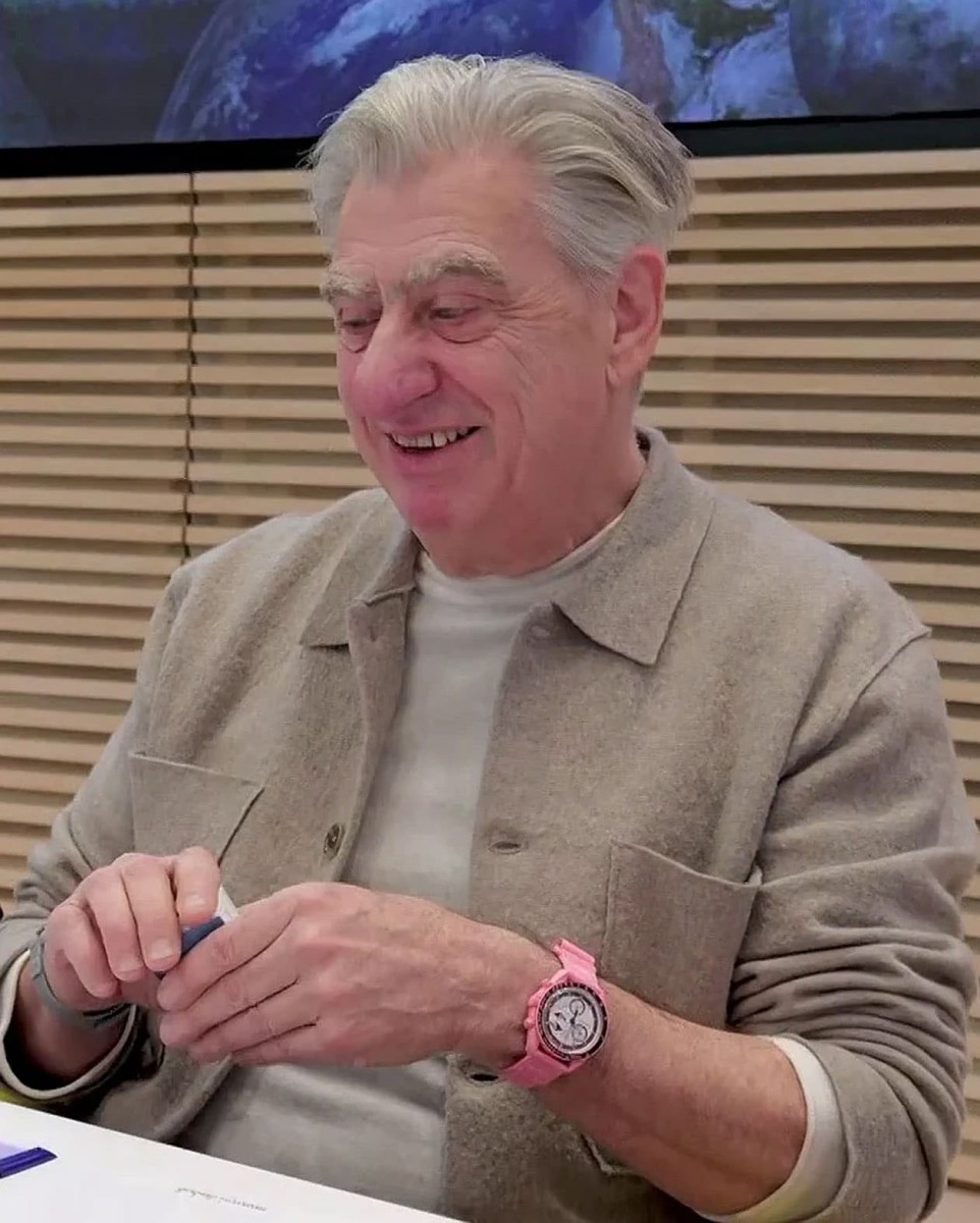 這種特殊的行銷方式套用在顏色如此醒目的手錶上還蠻合拍的,但是照理說現在還不到手錶正式開賣的時間,但卻已經有人已經搶先戴上它趴趴走了;別擔心,這不是因為SWATCH偷跑先賣,而是最近Swatch集團總裁Nick Hayek出席該集團的媒體發佈會時被拍到他先戴為快——由於那場活動舉行時還早於Bioceramic MoonSwatch Mission to the Pink Moonphase的發表時間,因此當場也沒人知道Hayek先生戴的是什麼名堂的MoonSwatch,頂多只會被它的搶眼配色吸引。