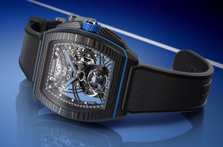 碳纖維材質/手動上鍊機芯/時、分、大日期顯示/陀飛輪裝置/藍寶石水晶鏡面、透明底蓋/防水100米/錶徑51x43mm/參考價:NT$ 2,780,000