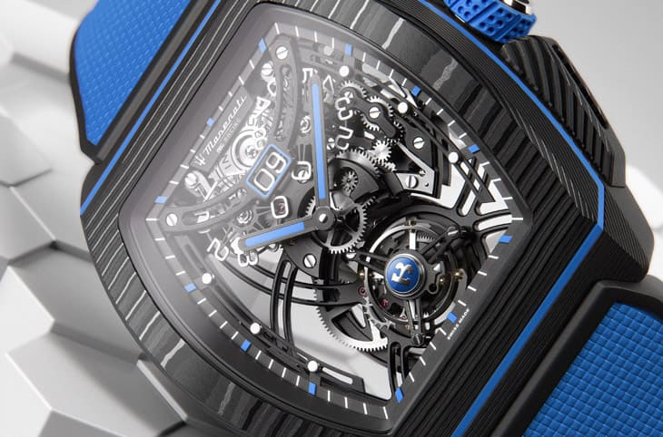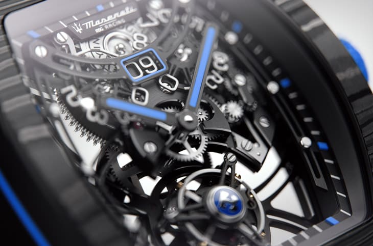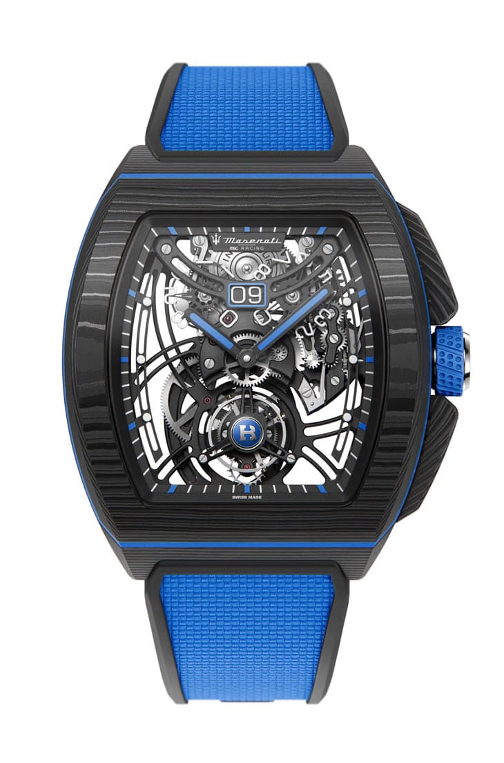 錶殼尺寸為51x43mm,從錶側欣賞手錶會注意到其帶有弧形,此為BIANCHET考量人體工學與佩戴舒適度而精準拿捏的造型線條。用以製作錶殼的碳纖維製作過程相對繁雜,以500層僅0.03mm的碳纖維壓縮而成,有助於降低手錶整體重量,這款Flying Tourbillon Grande Date B1.618看起來體型碩大,但實際上因為其採用了碳纖維材質,加上機芯有鏤空處理,因此重量實際上只有55克(Carbon),這也是車手能夠安心佩戴其上場競速的關鍵原因。此外面盤12點方向原本BIANCHET Logo位置改放MASERATI MSG Racing車隊標誌更是在藍色元素之餘強化雙方聯名血統的點睛之筆,賦予手錶同中求異的收藏價值。